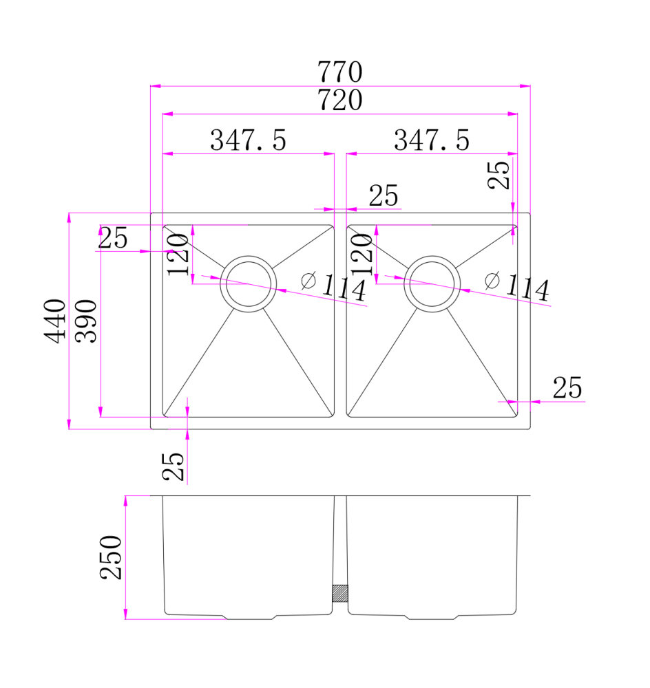 Body Type: Undermount Double Bowl. Size: 770*440*250mm. Shape: Kitchen Sink304SS