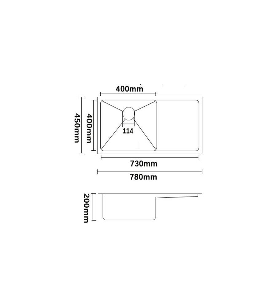 Body Type: Undermount Single Bowl with Drainer Board304SS,. Size: 780*450*200mm. Thickness: satin finish, 1.2mmthickness